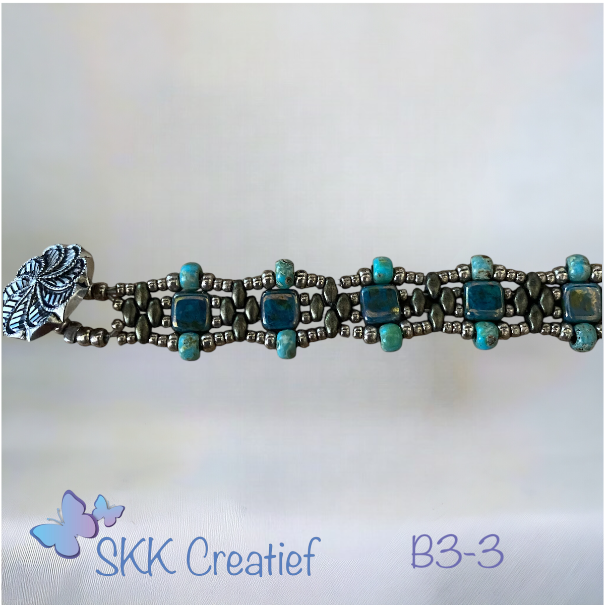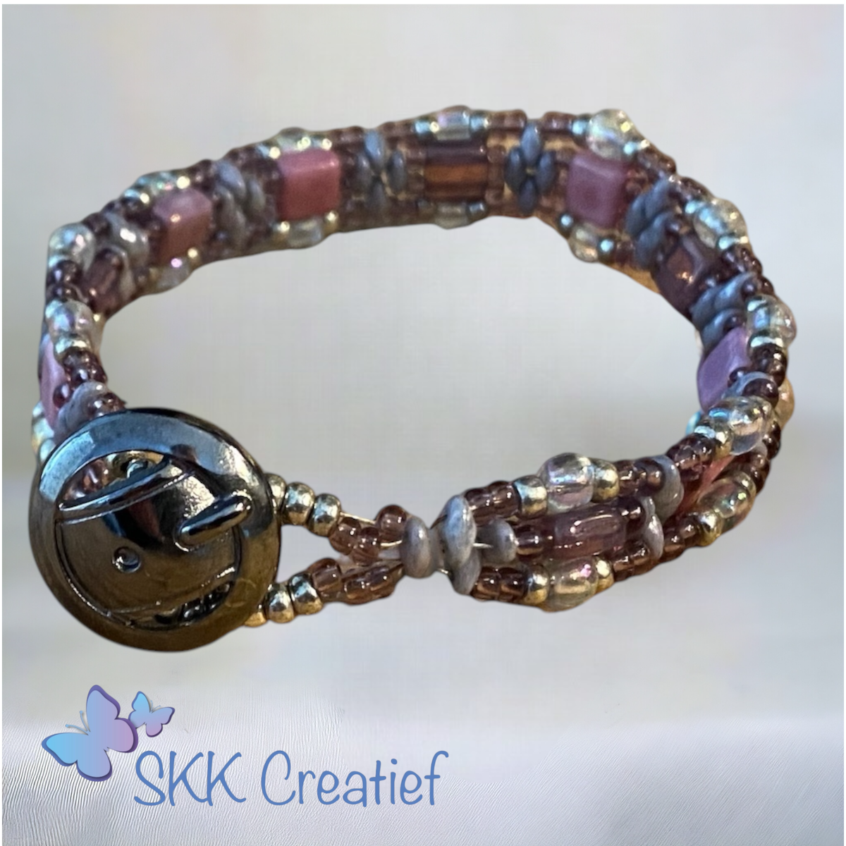 De armband is gemaakt met miyuki Tila Beads, Super duo beads en rocailles. De armband sluit met een knoop.