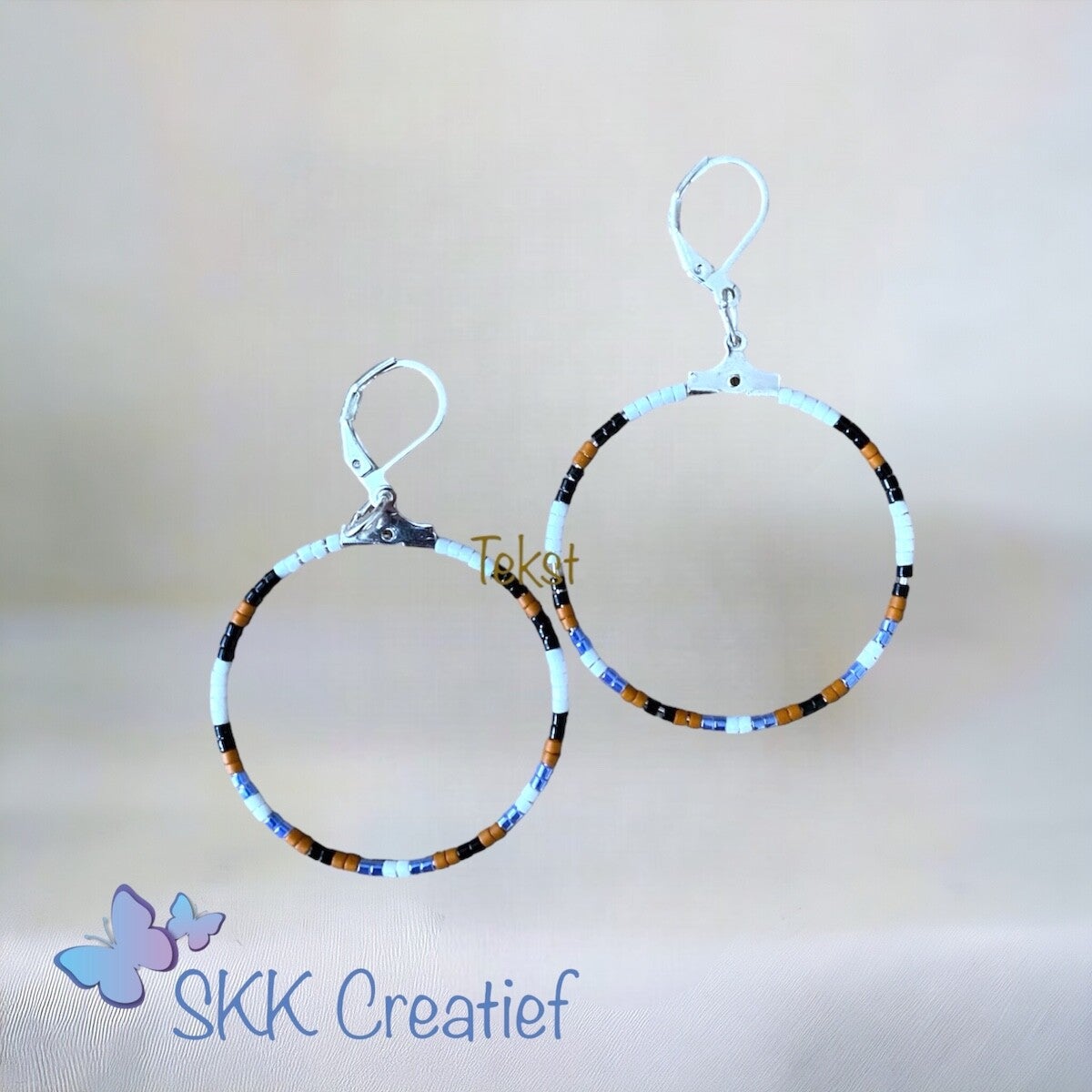 Oorbellen met miyuki delica kralen in verschillende kleuren. Doorsnee = 3 cm Lengte 4,5 cm. Keuze A = Goud, Keuze B = Zilver