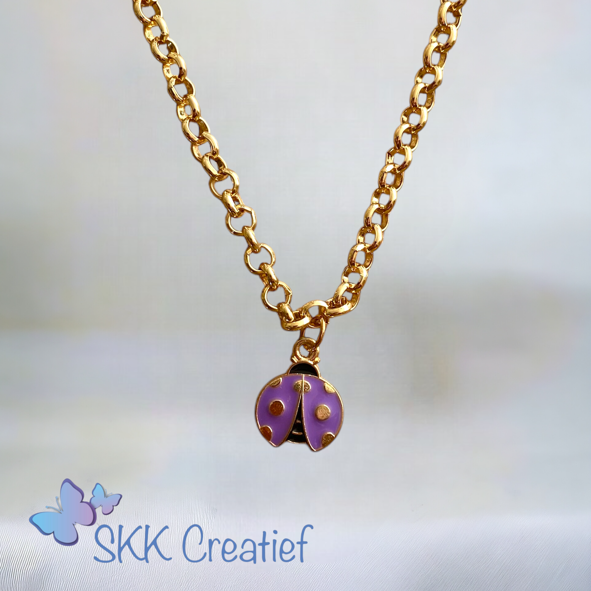 Een leuke meiden ketting van dq gouden 4mm jasseron met een leuk lieveheersbeestje bedel.Er zijn meerdere kleuren. A = Paars B = Roze. De lengte van de ketting is 45-50 cm en afgewerkt met een karabijnsluiting.