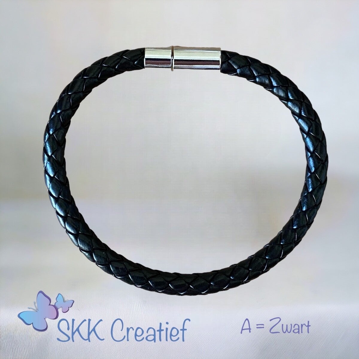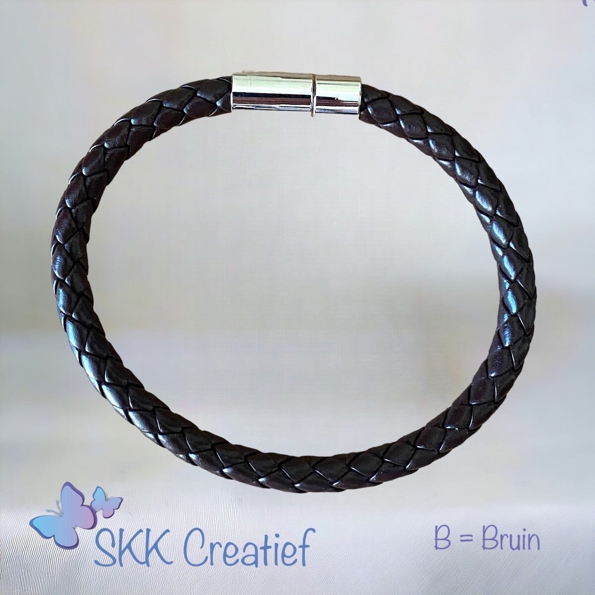 Een armband voor heren van gevlochten leer. De armband sluit met een kliksluiting. Geschikt voor een pols van 21 cm.