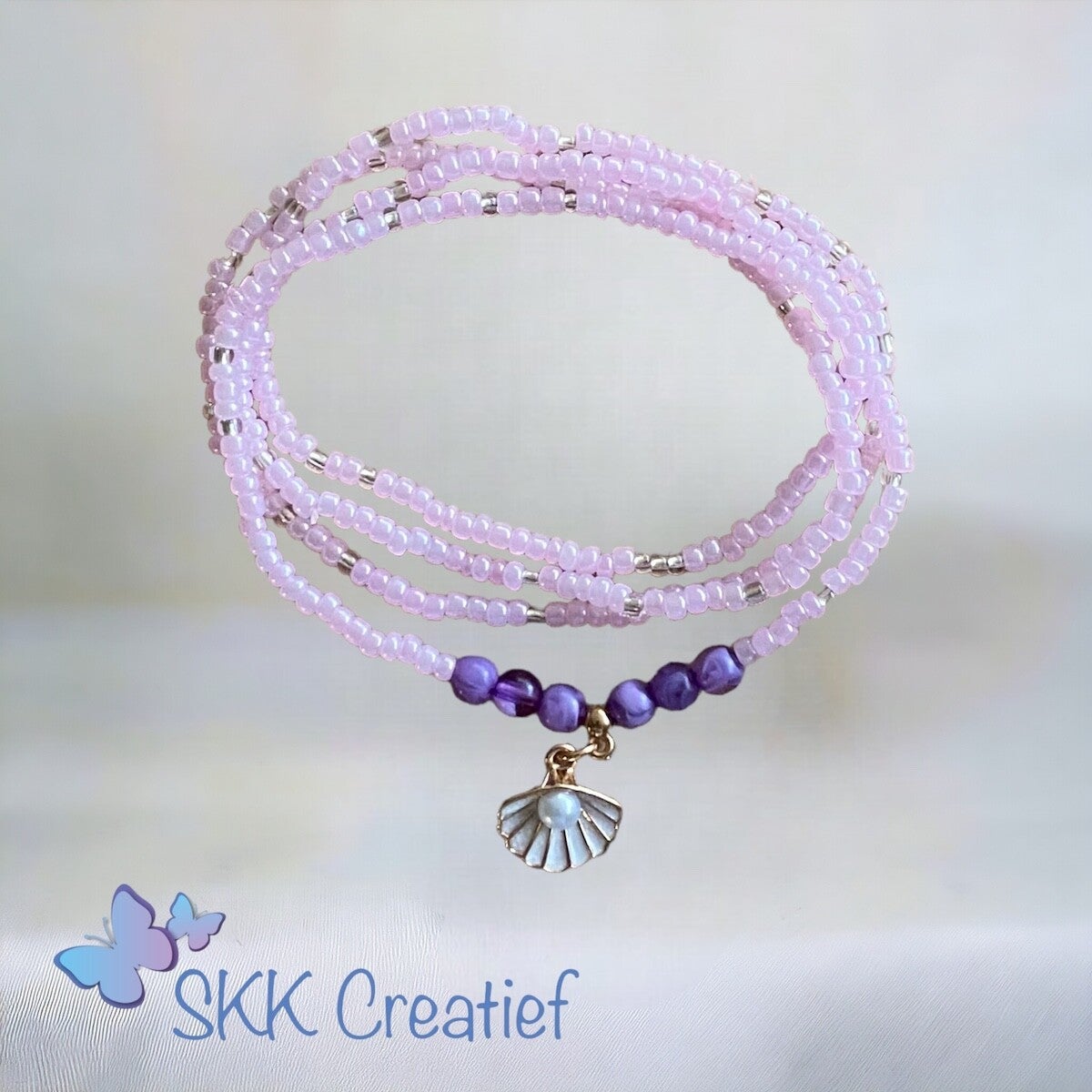 Een zomers enkelbandje die meerdere keren om je enkel past in de kleur licht roze met paarse kralen en een leuke bedel in de vorm van een schelp. Eventueel kan je hem ook als ketting of armband dragen. Geregen op elastiek, dus past altijd.