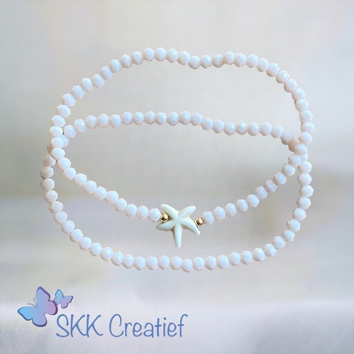 De zomerse enkelbandjes zijn gemaakt met 4x3 facet kralen in de kleur roomwit met een zeester kraal en regenbooghematiet goud geregen op elastiek.