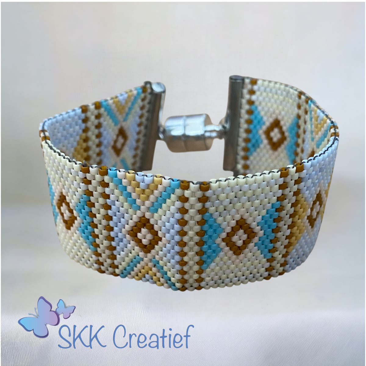 De armband is gemaakt met de mooie miyuki delica kralen in zachte en mooie kleurenpracht. Een mooi design. De armband is gesschikt voor een pols van 17-19 cm en sluit met een magneetsluiting. Heeft u liever een andere sluiting, neem dan contact op.