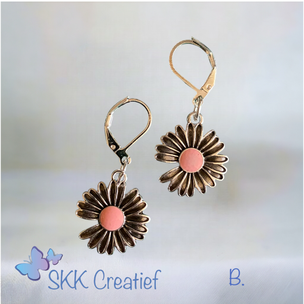Zilveren(925) oorbellen met een leuke madelief hanger met een rood of roze hartje. De oorbellen zijn mooi te combineren met:Ketting Steffy