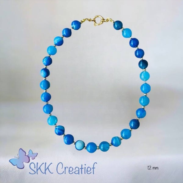 De ketting is gemaakt met Zeeblauwe Streep Carneool afgewisseld met 4 mm gold plated spacer kralen.